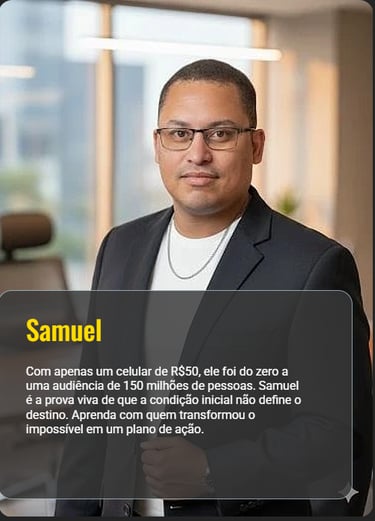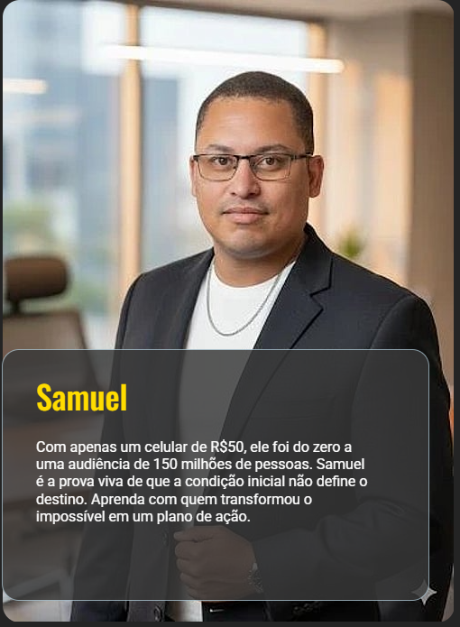 Exemplo vivo de superação, Samuel mostra como é possível sair do zero e alcançar resultados extraordinários utilizando o poder das redes sociais para criar relevância, gerar impacto e mudar de vida.